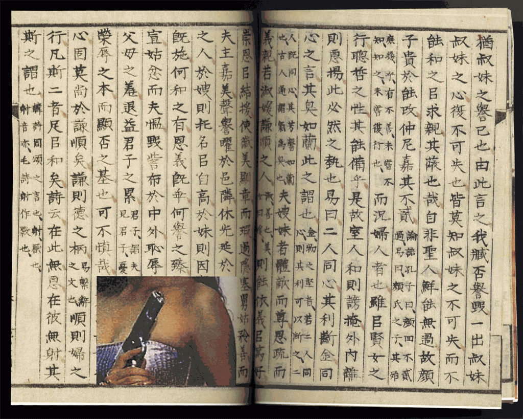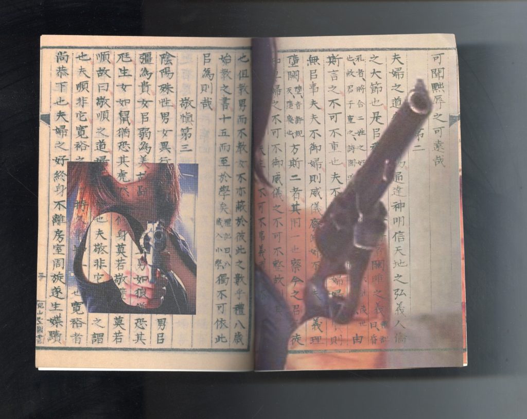 Overlaying images and text is a common strategy used in China’s censorship system. In response, I collected images of female fighters from B-grade exploitation films and used them to cover texts saturated with patriarchal ideology—as a form of “reverse censorship.”